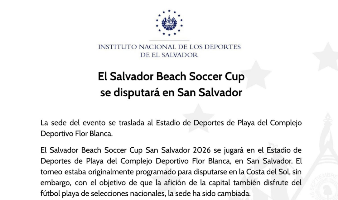 El Instituto Nacional de los Deportes de El Salvador (INDES) anunció oficialmente que la prestigiosa Beach Soccer Cupse llevará a cabo en las instalaciones del Estadio de Deportes de Playa, ubicado en el Complejo Deportivo Flor Blanca, en San Salvador. El torneo internacional está programado para los días 2, 3 y 4 de abril, fechas en las que se espera una alta afluencia de aficionados para apoyar a las selecciones nacionales, tanto masculina como femenina.