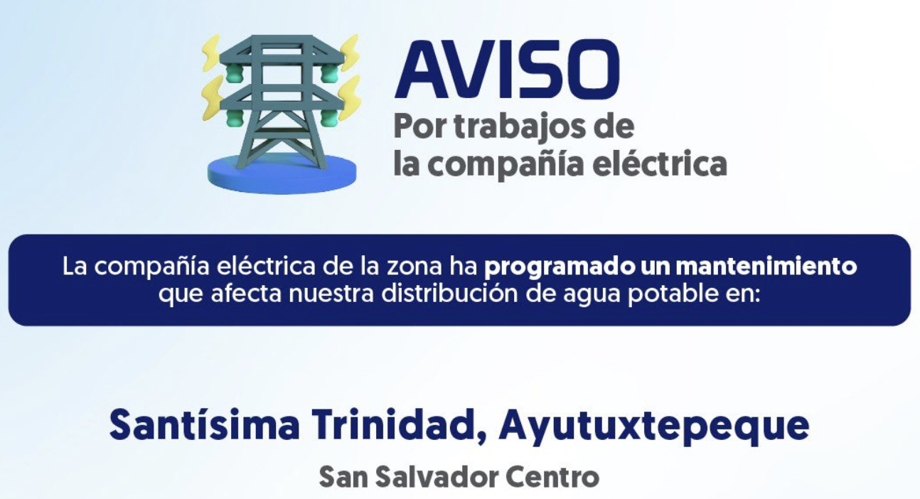 La Administración Nacional de Acueductos y Alcantarillados (ANDA) informó a los habitantes del distrito de Ayutuxtepeque, en San Salvador Centro, que el servicio de agua potable presentará deficiencias temporales debido a factores externos a la red hídrica.