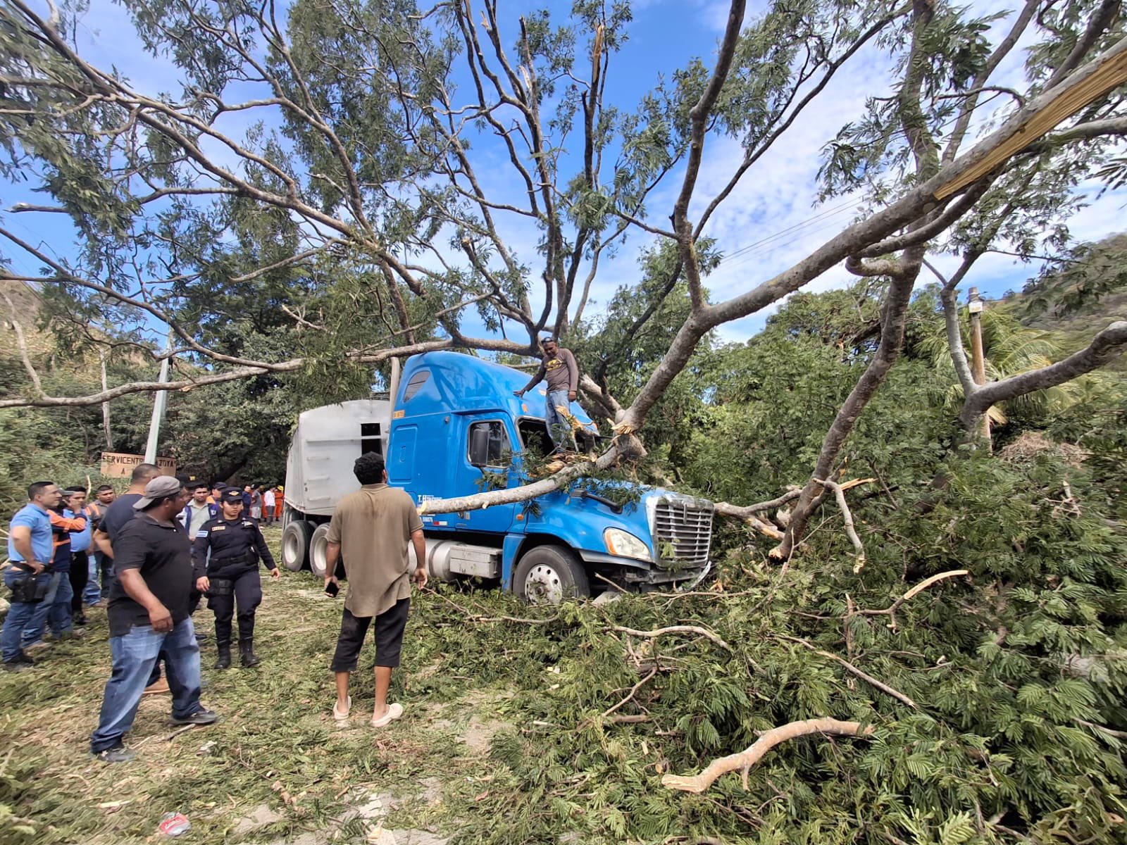 Un incidente vial se registró a la altura del kilómetro 80 de la carretera que conduce hacia Texistepeque, en el distrito de Santa Ana Norte, donde un árbol de grandes dimensiones se desplomó repentinamente sobre la vía. El tronco y las ramas impactaron directamente sobre dos rastras que se encontraban en plena marcha en ese momento.