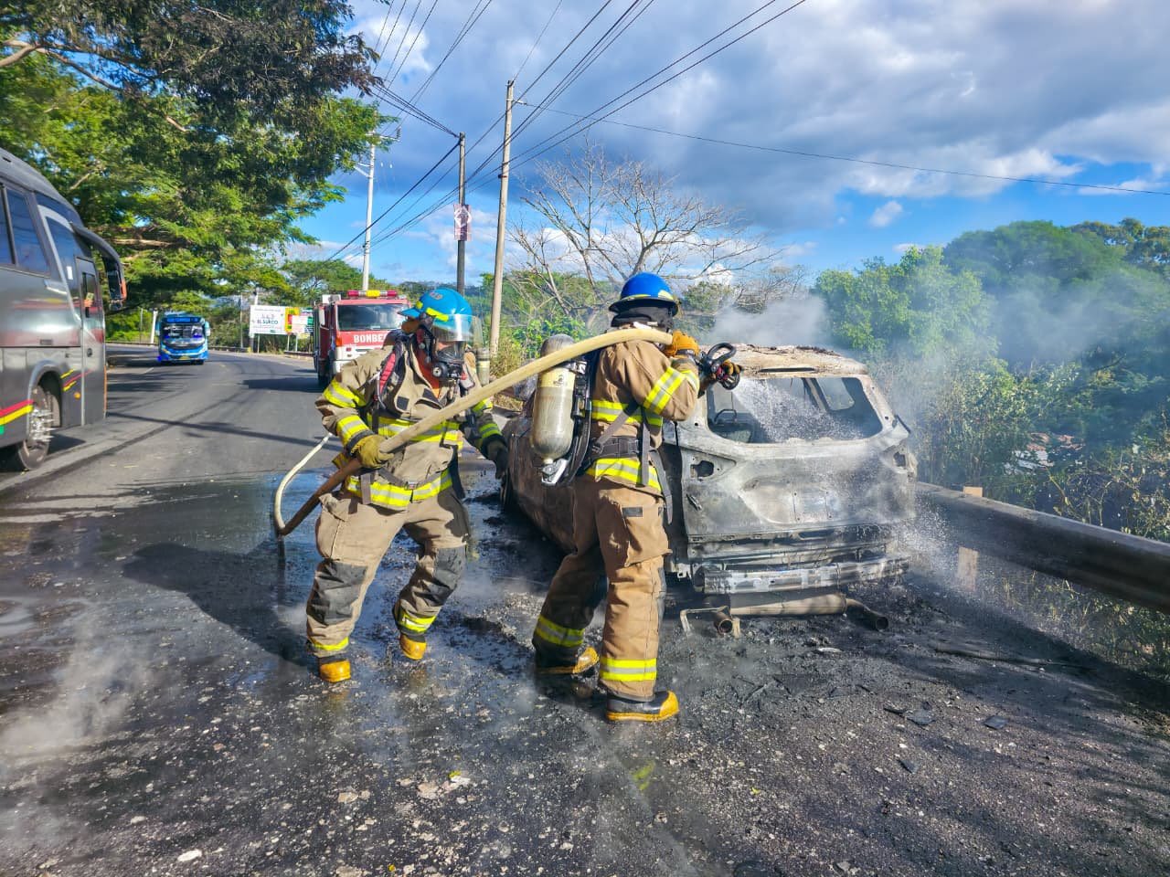 El Cuerpo de Bomberos de El Salvador se desplazó al kilómetro 45 de la carretera Troncal del Norte para sofocar un incendio vehicular registrado a la altura de la colonia Las Brisas, en el cantón Colima. El equipo de bomberos trabajó rápidamente en el lugar para controlar las llamas y evitar que el fuego se propagara hacia la maleza seca o estructuras cercanas.
