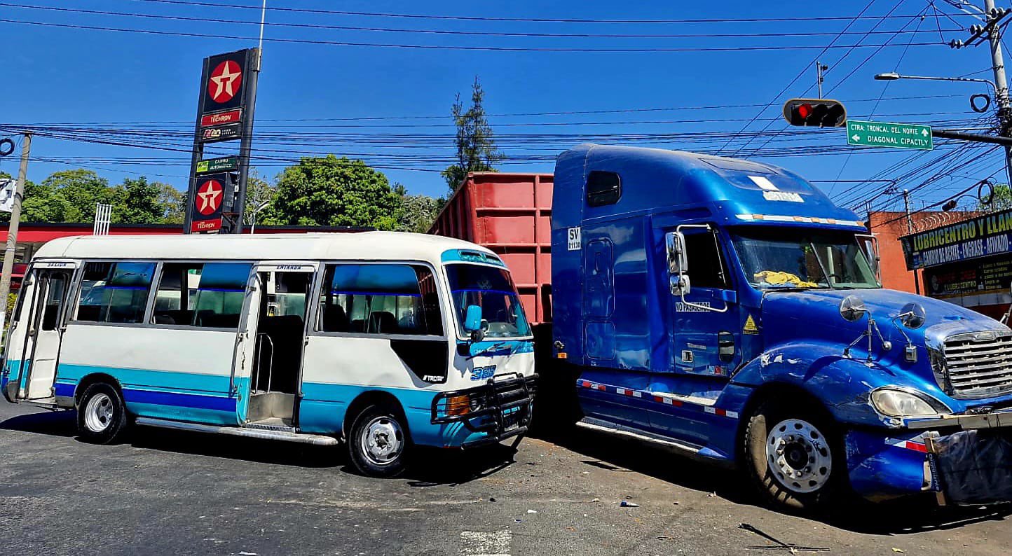 Un fuerte accidente de tránsito se registró en el kilómetro 3 de la carretera Troncal del Norte, en la jurisdicción de San Salvador, dejando daños materiales y complicaciones en el tráfico. Agentes de la Policía Nacional Civil acudieron al lugar para inspeccionar la escena, donde un camión de carga pesada colisionó contra una unidad del transporte colectivo.