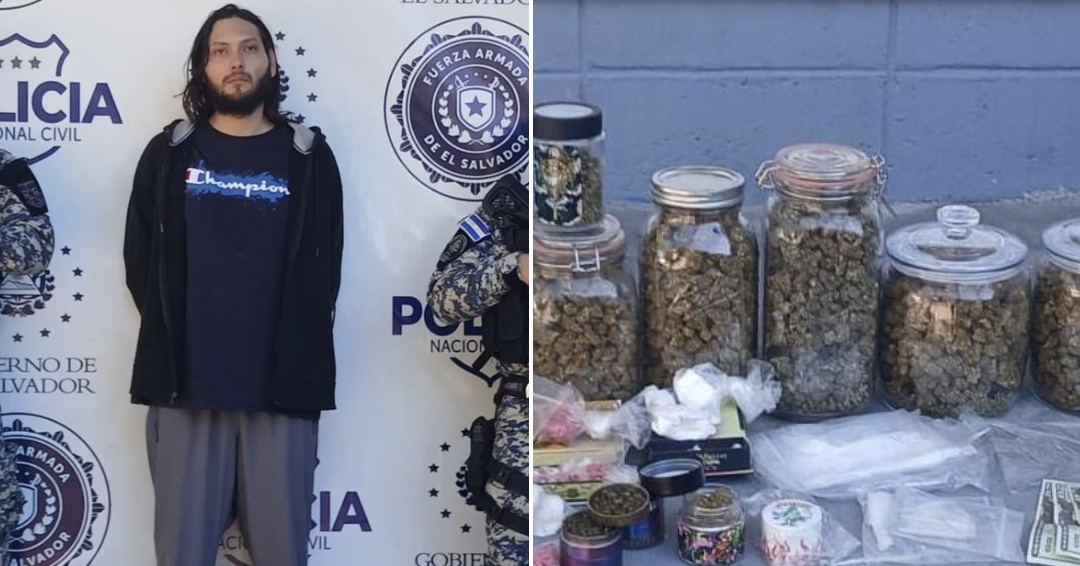 La Policía Nacional Civil (PNC) capturó en el distrito de Ilopango a Javier Durón Ramos, quien es señalado como distribuidor de diversas sustancias ilícitas. Durante el procedimiento, las autoridades le incautaron un cargamento variado que incluía 10 botes con marihuana, porciones de crack, cocaína, éxtasis y metanfetaminas, además de otros artículos relacionados con la comercialización de estupefacientes.