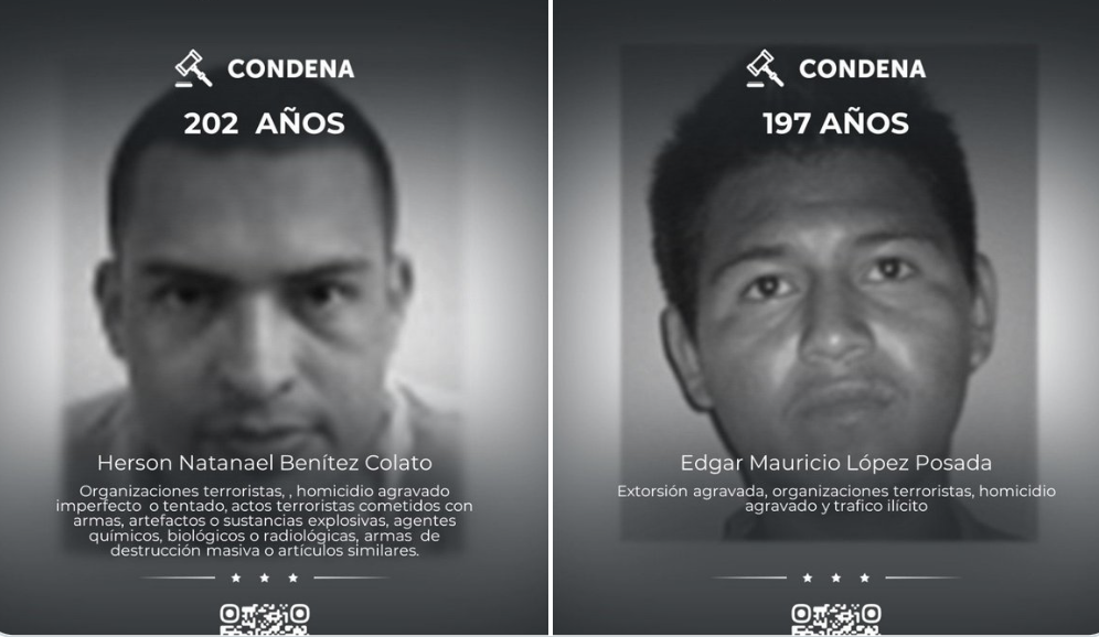 Entre los condenados, José Salvador Cárcamo recibió la pena más alta: 472 años de cárcel. Su sentencia se debe a una acumulación de delitos que incluyen homicidio, actos terroristas cometidos con armas y explosivos, organizaciones terroristas, extorsión, tráfico ilícito y asociaciones delictivas agravadas.