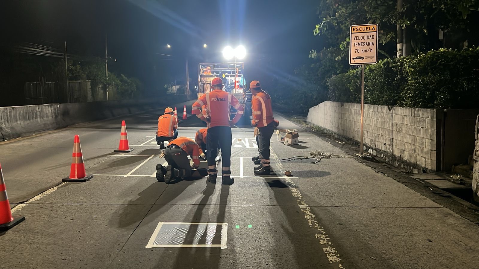 Durante la noche, un equipo del Fondo de Conservación Vial (FOVIALITO) ejecutó trabajos de señalización vial horizontal y vertical sobre la carretera Troncal del Norte.