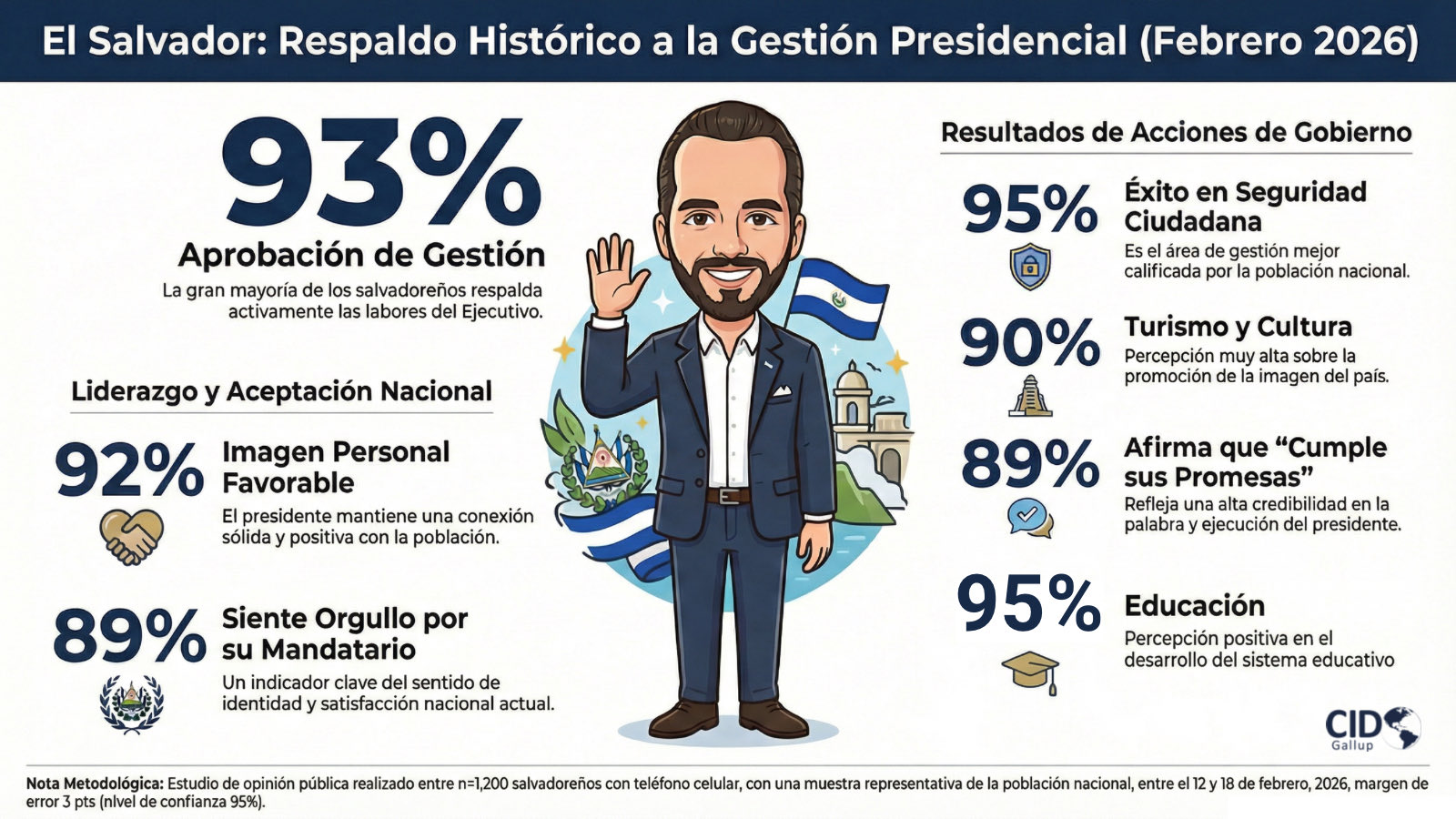 La casa encuestadora CID Gallup reveló los resultados de su estudio de opinión pública correspondiente a febrero de 2026, en el que la gestión del Presidente Nayib Bukele registra un sólido 93% de aprobación ciudadana. Este nivel de respaldo se mantiene entre los más altos de la historia reciente del país, reflejando una validación masiva al rumbo que lleva la nación tras más de seis años de administración.