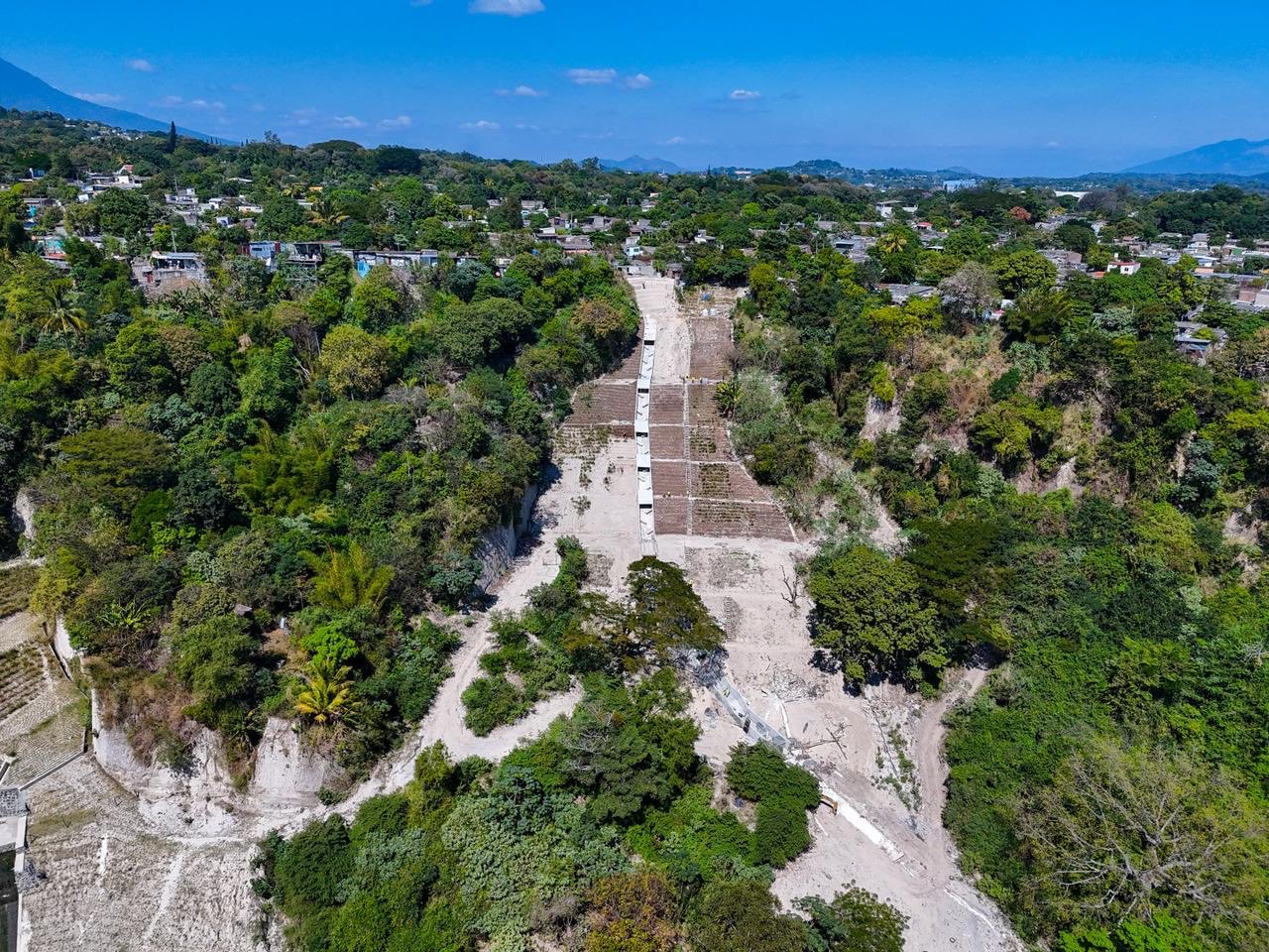 Los trabajos consistieron en el relleno masivo del terreno, la estabilización de taludes y la construcción de un nuevo sistema de drenaje para canalizar adecuadamente las aguas lluvias, evitando que futuras correntadas vuelvan a socavar el suelo.