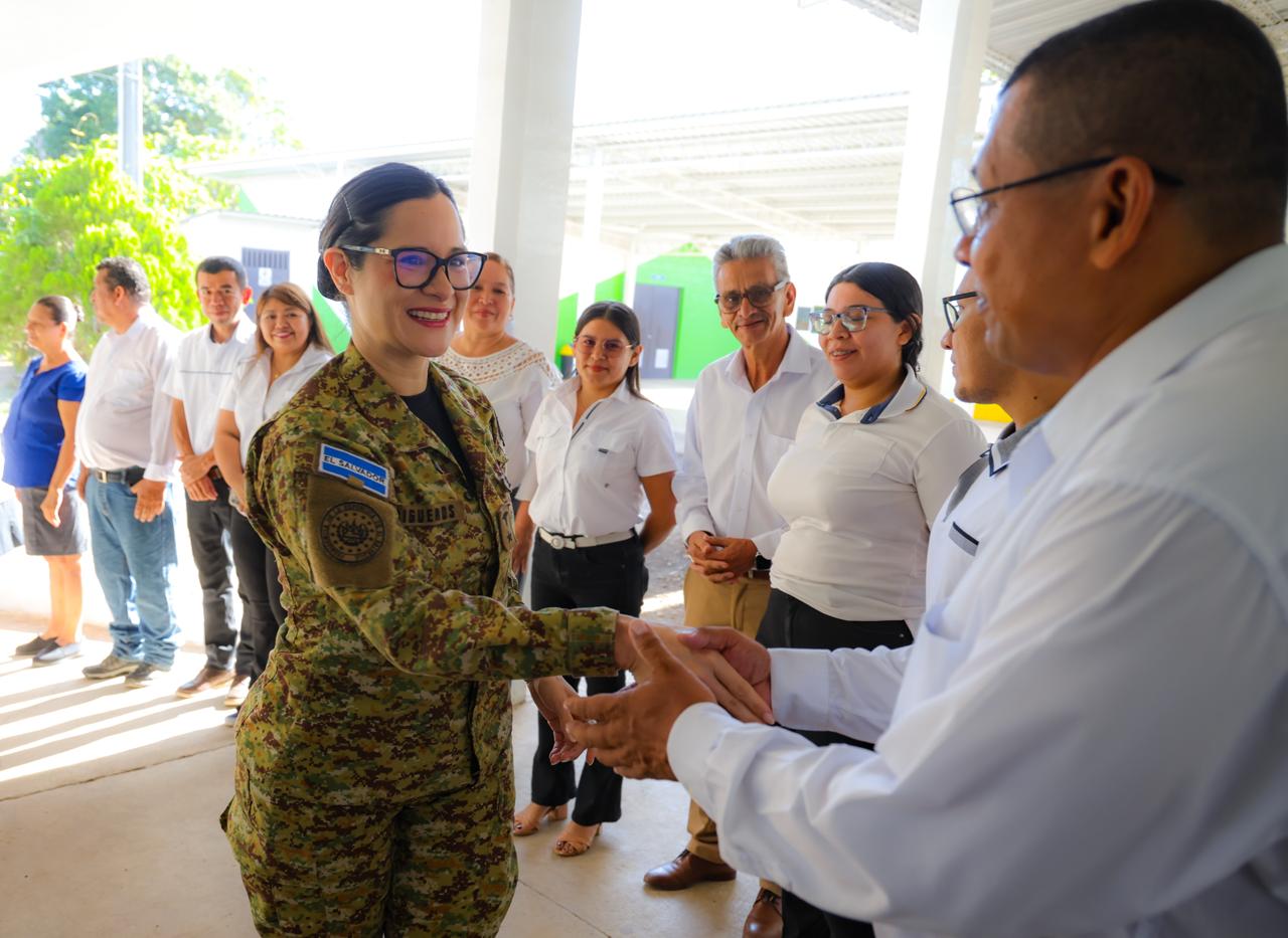 La ministra de Educación, Karla Hananía de Varela, visitó este día el Centro Escolar Ingeniero Antonio Mejía, ubicado en el distrito de Lolotique, San Miguel Oeste. El objetivo de la visita fue supervisar personalmente la jornada de cambio de tallas de uniformes y calzado escolar para los estudiantes de la zona.