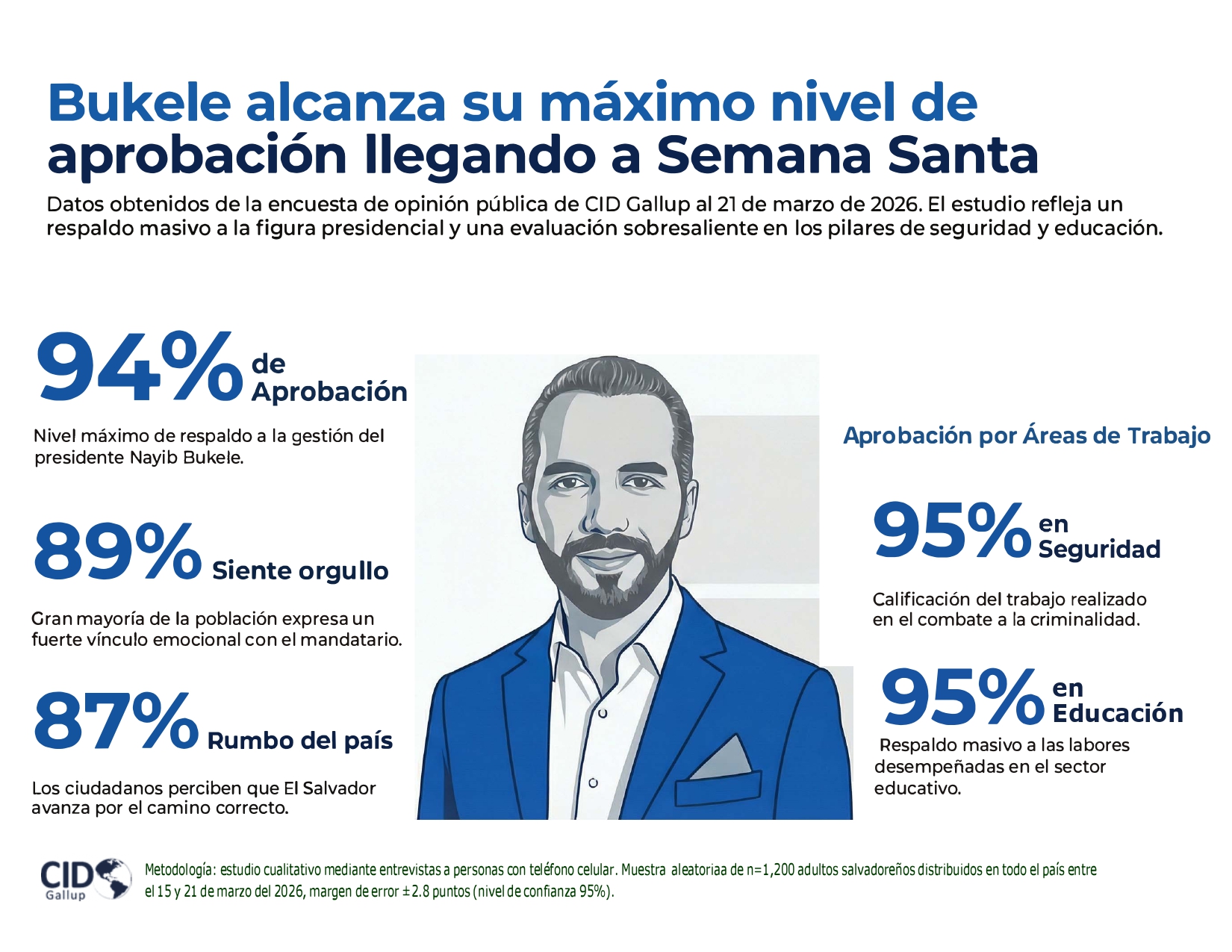 El Presidente de la República, Nayib Bukele, resaltó este jueves los resultados de la más reciente encuesta de la firma consultora CID Gallup, los cuales posicionan su gestión con un nivel de aceptación sin precedentes.