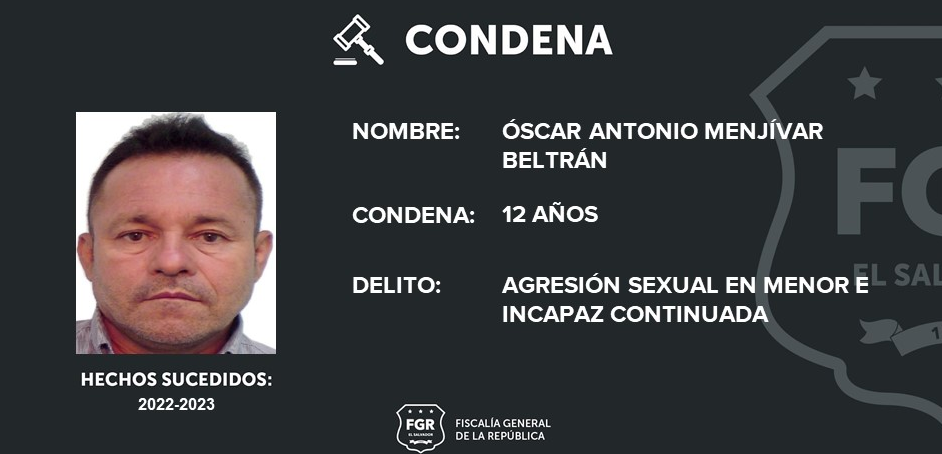 La Fiscalía General de la República (FGR) logró 12 años de prisión para Óscar Antonio Menjívar Beltrán, por haber tocado indebidamente a una niña de 10 años de edad en Chalatenango.
