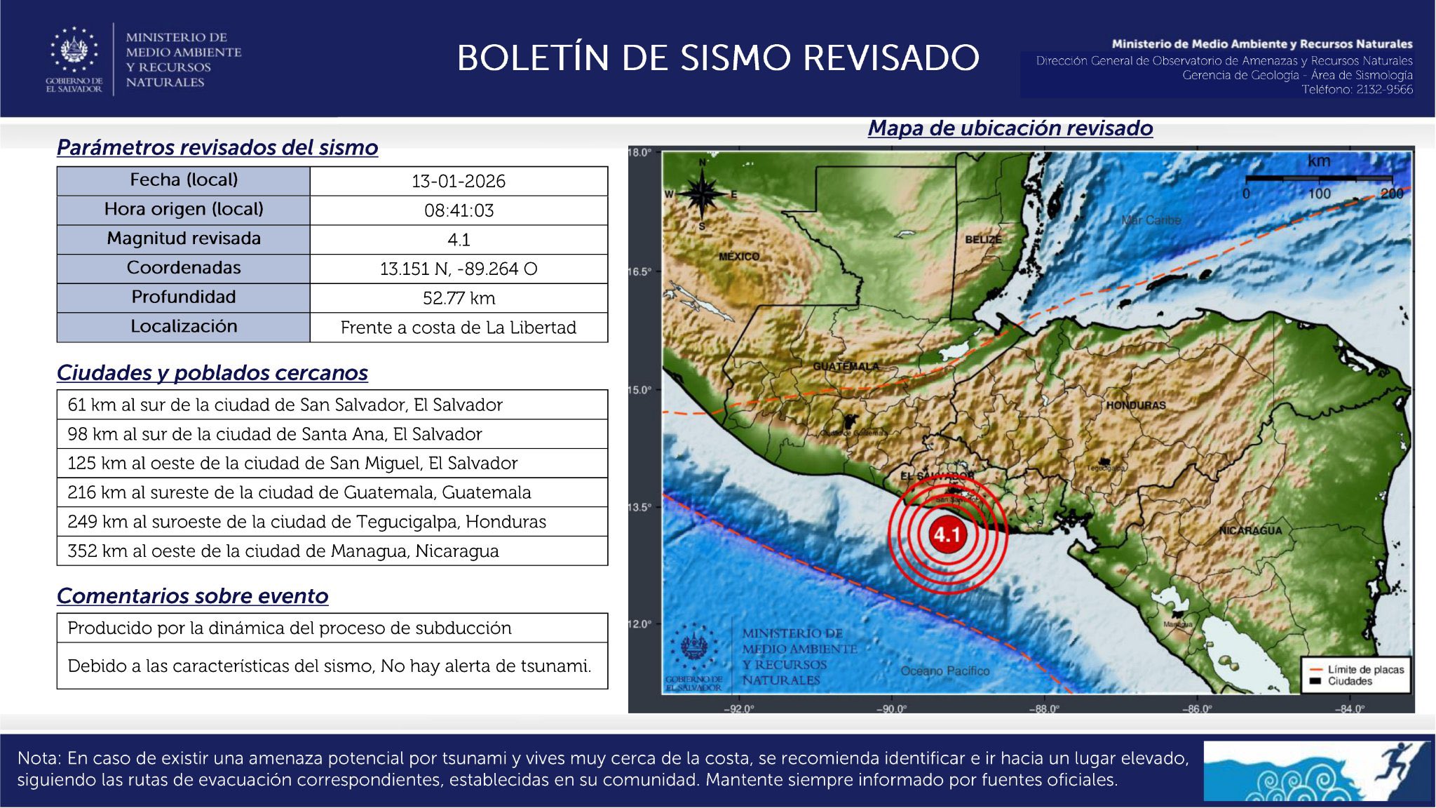 El Ministerio de Medio Ambiente y Recursos Naturales (MARN) informó sobre un sismo de magnitud 4.1 que se registró frente a la costa del departamento de La Libertad. El movimiento telúrico ocurrió específicamente a 32.0 kilómetros al suroeste de la Playa La Zunganera, con una profundidad de 53 kilómetros, lo que permitió que fuera percibido en diversas zonas de la franja costera y el Área Metropolitana de San Salvador.