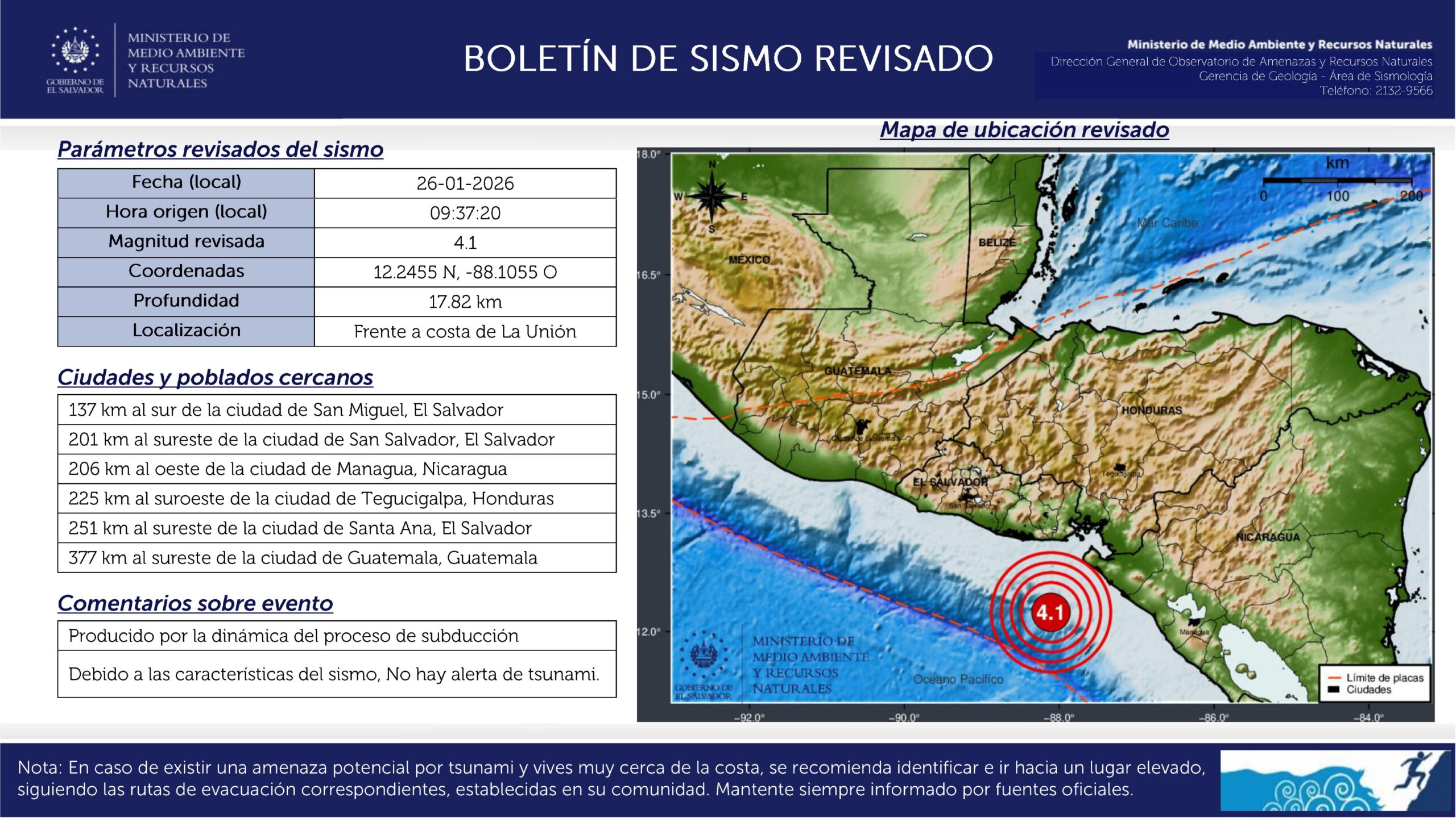El Ministerio de Medio Ambiente y Recursos Naturales (MARN) informó sobre un sismo de magnitud 4.1 registrado frente a la costa del departamento de La Unión. Según los datos del Observatorio de Amenazas, el epicentro se localizó a 102.0 kilómetros al sur de la Playa Las Tunas, con una profundidad que no representó una amenaza de tsunami para el litoral salvadoreño.
